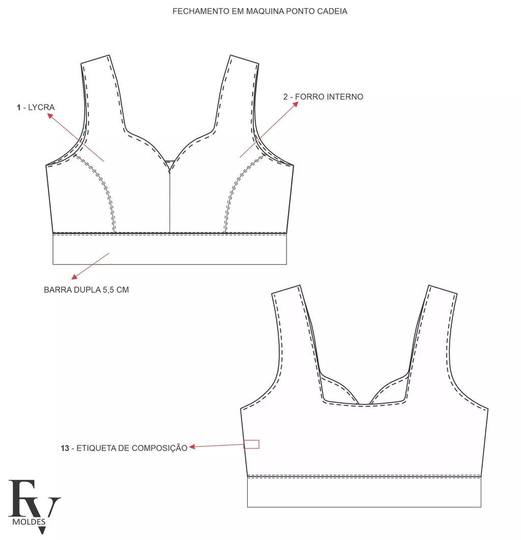 • Ficha com desenho técnico: visualize estrutura, costuras e detalhes do top antes da confecção.